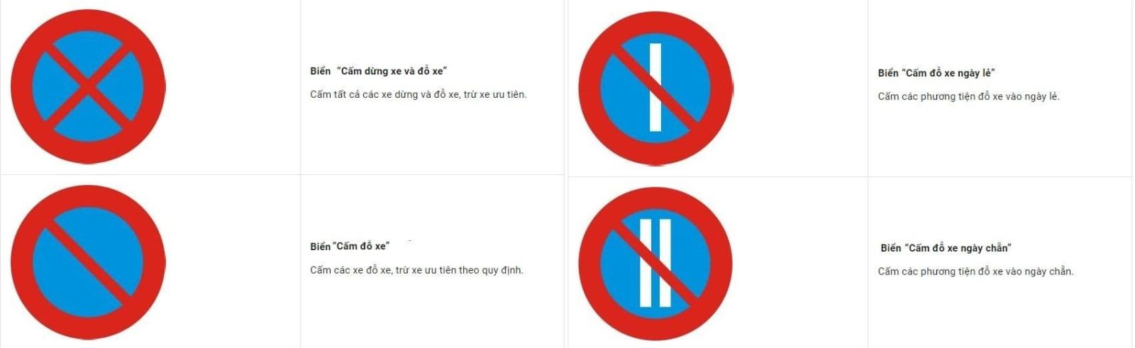 - Biển "Cấm dừng và đỗ xe" (P.130): Cấm tất cả hành vi dừng và đỗ xe tại khu vực đặt biển, trừ xe ưu tiên.