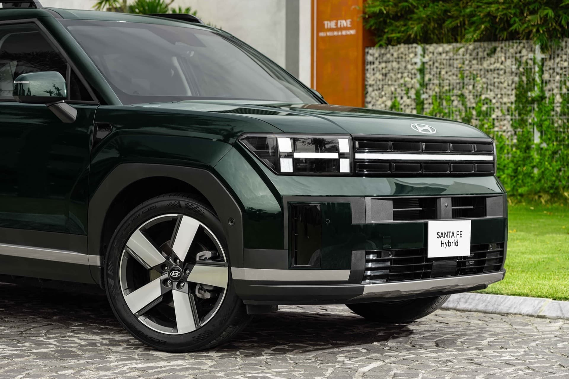Santa Fe Hybrid gây ấn tượng mạnh mẽ với ngôn ngữ thiết kế "Boxy" đậm chất SUV cổ điển, thể hiện sự mạnh mẽ và sang trọng. Sử dụng khung gầm N-Platform hiện đại, xe có kích thước Dài x Rộng x Cao lần lượt là 4.830 x 1.900 x 1.770 mm, chiều dài cơ sở 2.815 mm mang đến không gian nội thất rộng rãi và thoải mái. Lazang xe có kích thước 20 inch với bộ lốp có thông số 255/45R20.